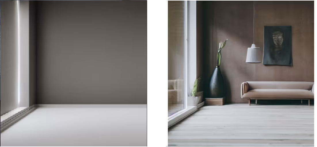 These parameters balance quality with generation speed. The high step count ensures detailed furniture rendering, while the moderate denoising strength preserves the original room structure.