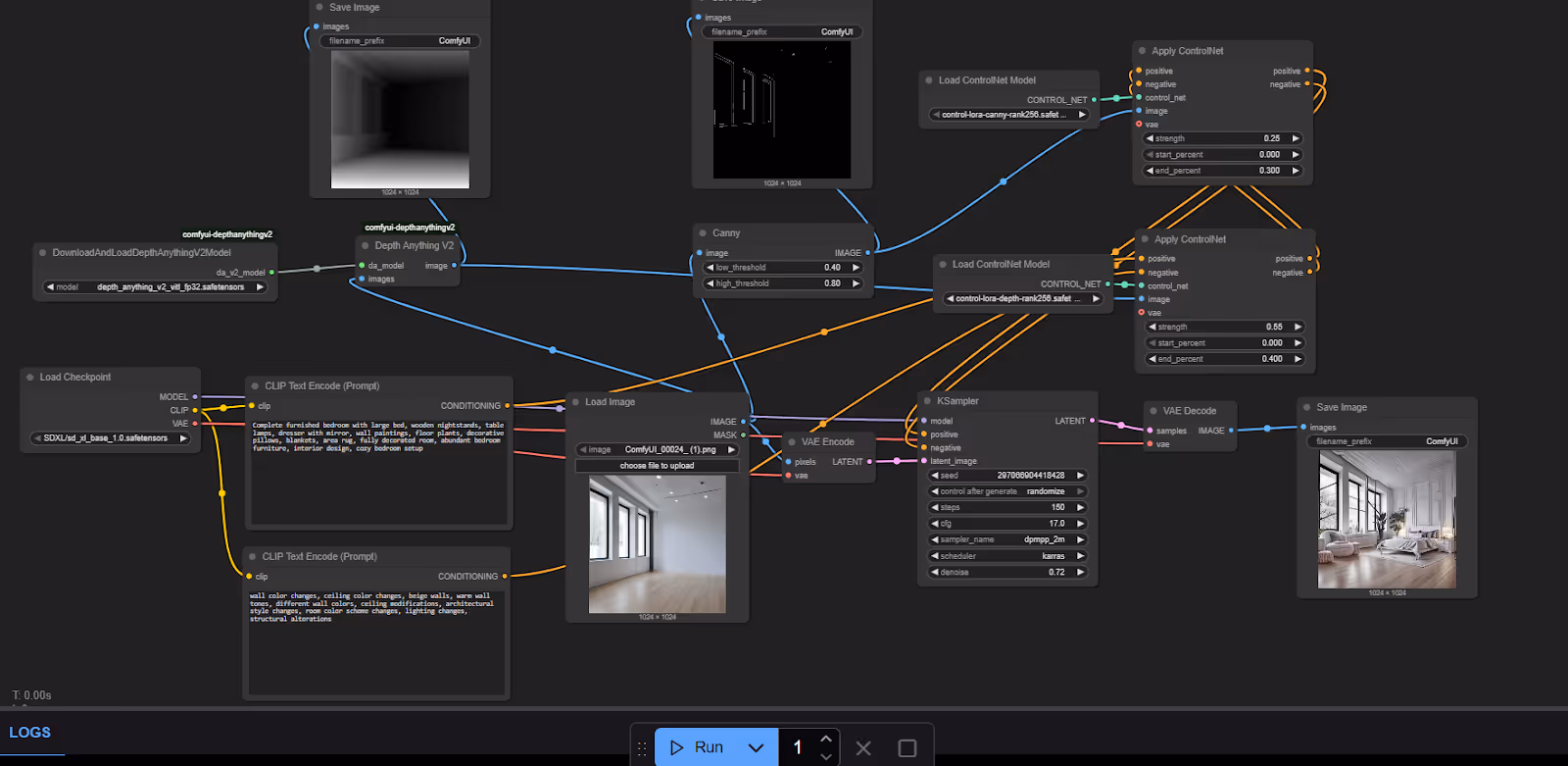 Test it out with an empty room image—make sure all nodes are properly connected (no red indicators)—and click "Run." Your first virtual staging should generate in 2–3 minutes, giving you a furnished room that preserves the original architecture.