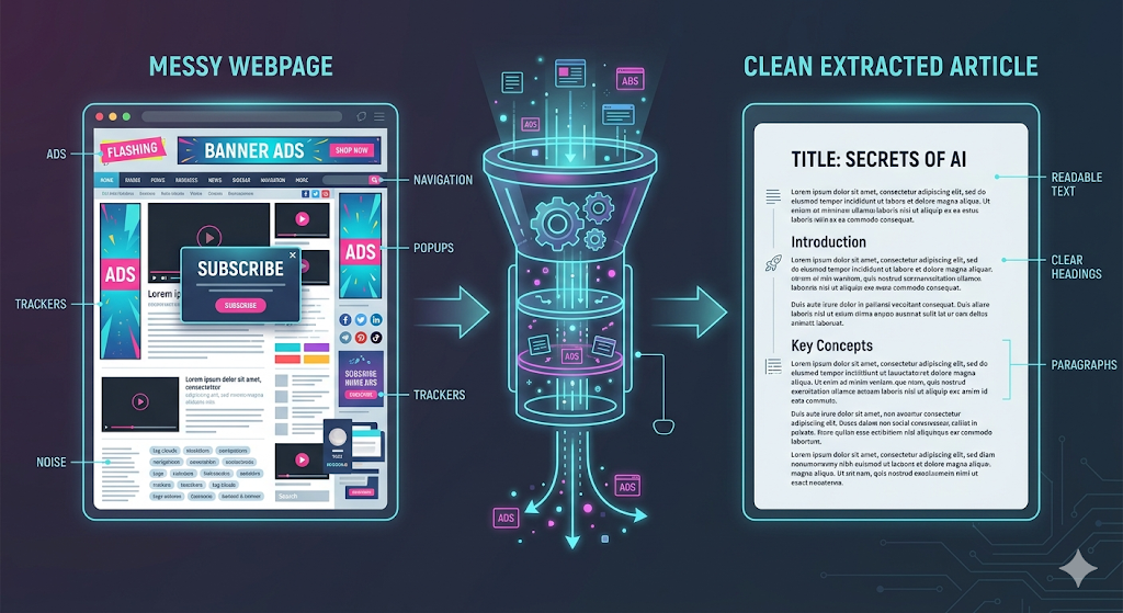 A raw webpage is messy. Along with the article itself, it contains navigation menus, footers, sidebars, cookie banners, newsletter signups, social media buttons, and more.