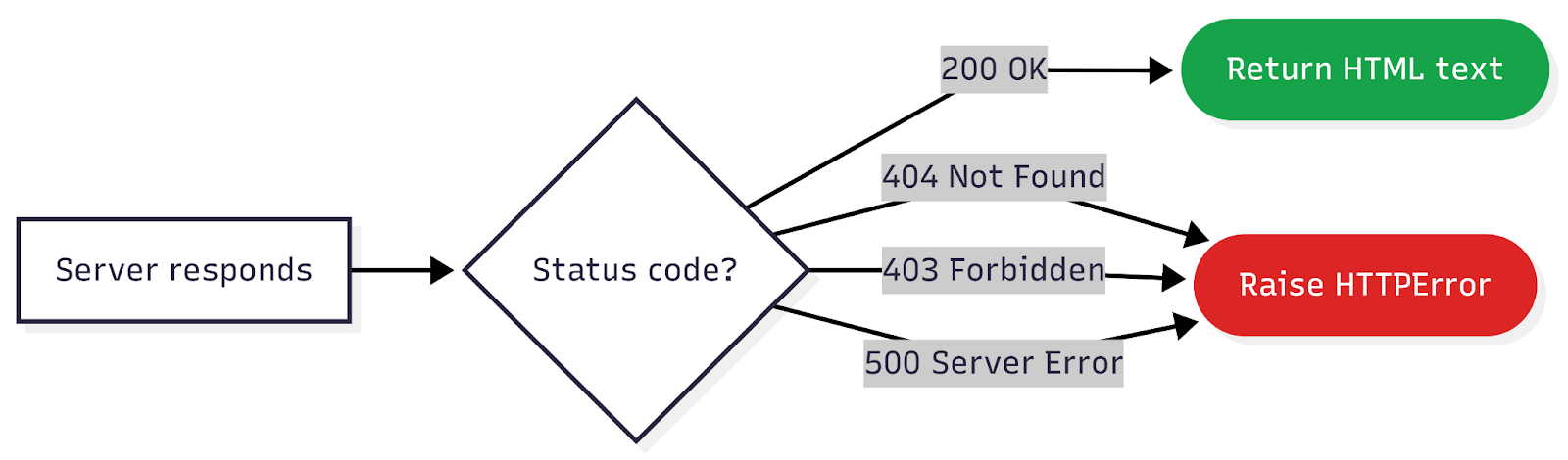 If the server returns an error (like 404 Not Found or 500 Server Error), raise_for_status() turns that into a Python exception right away — rather than silently returning an empty or broken page. It's a safety net.
