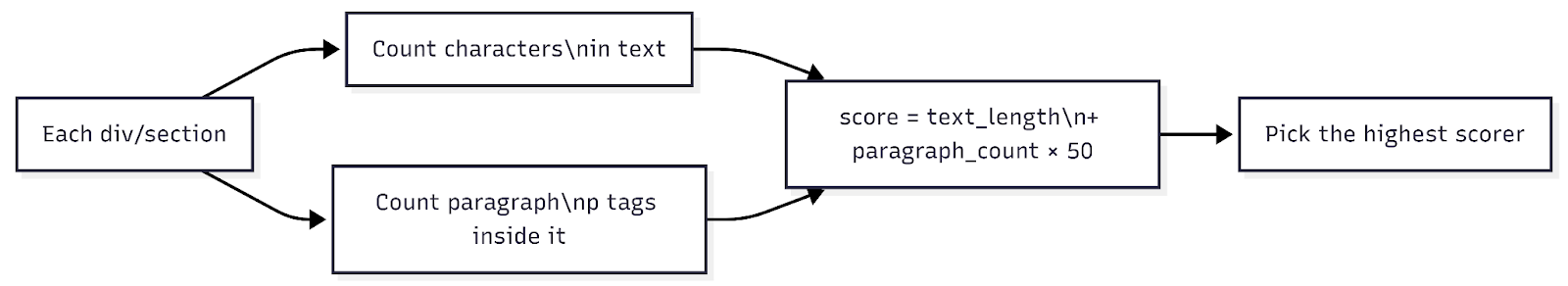 If none of the standard selectors match, we fall back to a scoring system. We score every <div> and <section> on the page and pick the one with the highest score:
