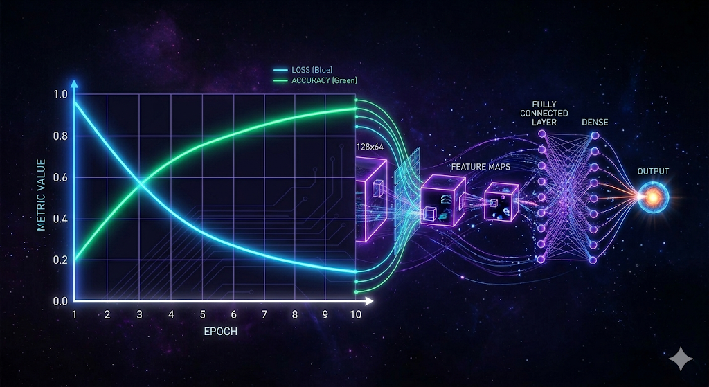 The model treats the 1 × 168 × 300 feature matrix as a single-channel image and uses two convolutional blocks to extract spatial patterns, followed by fully connected layers to classify.