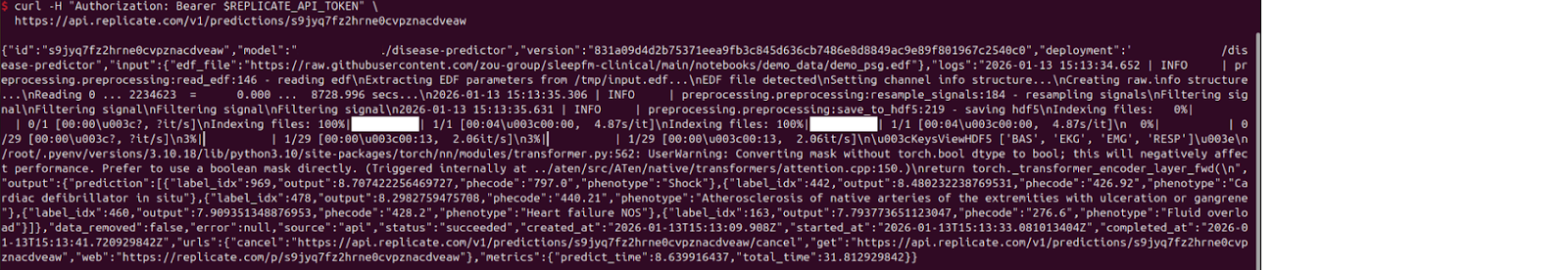 SleepFM shows how large-scale, multimodal foundation models can unlock clinically meaningful insights from raw sleep data when paired with the right engineering. By building an end-to-end EDF-to-prediction pipeline and deploying it with Cog and Replicate, we make advanced sleep modeling more accessible, reproducible, and usable beyond the research setting.