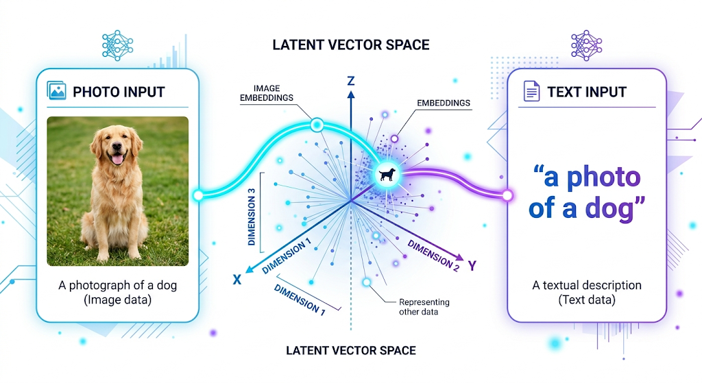 The result is a model that understands both images and text in the same framework. It converts both into numerical vectors — called embeddings — and places them in a shared space. When an image and a text description are about the same thing, their embeddings end up close together in this space. When they are about different things, they end up far apart.