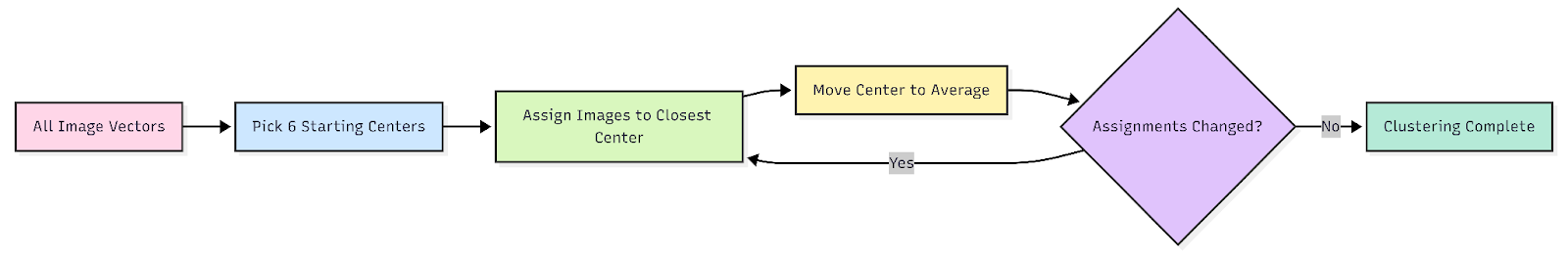 K-Means begins by placing six center points at random positions in the 512-dimensional space. It then assigns each image vector to its nearest center, moves each center to the average position of all its assigned vectors, and repeats this process until the assignments stop changing. The result is six groups, each containing images that are close to each other in embedding space.