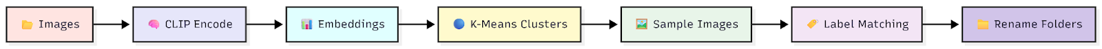Organize image datasets automatically using CLIP embeddings, K-Means clustering, and zero-shot labeling to group similar images and generate meaningful folder names without manual tagging.