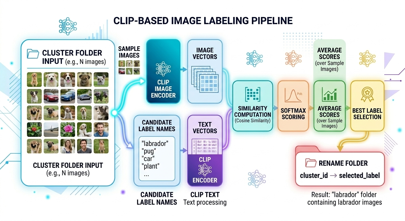 The dot product between an image vector and a text vector measures how aligned they are. Softmax converts all scores into a comparable format. The label with the highest average score across the five sampled images is assigned as the cluster name, and the folder is renamed accordingly.