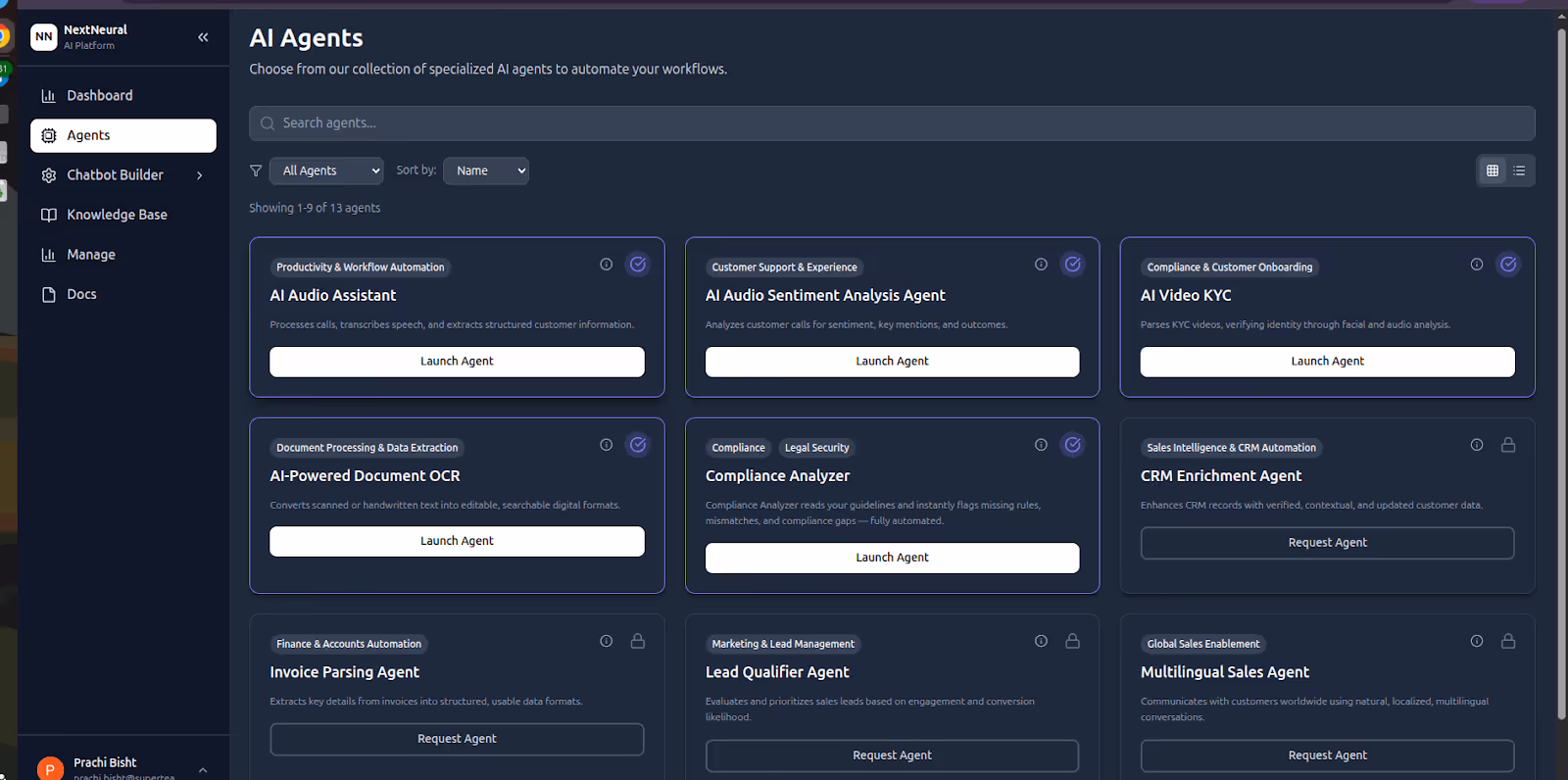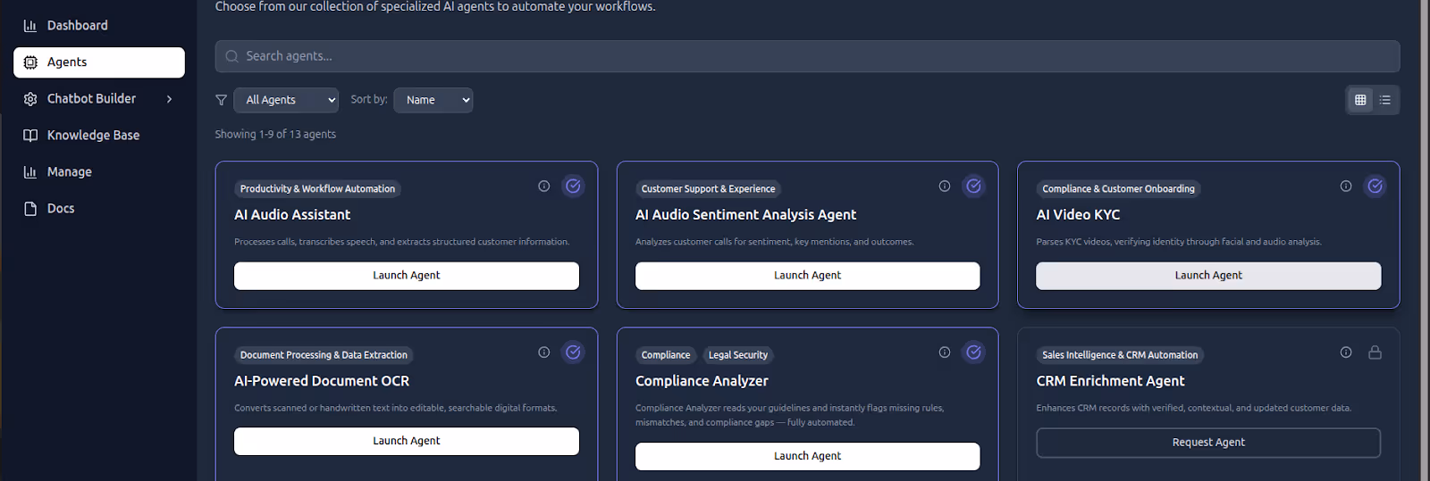 5. Navigate to Agents, choose AI Video KYC, and click Launch Agent.