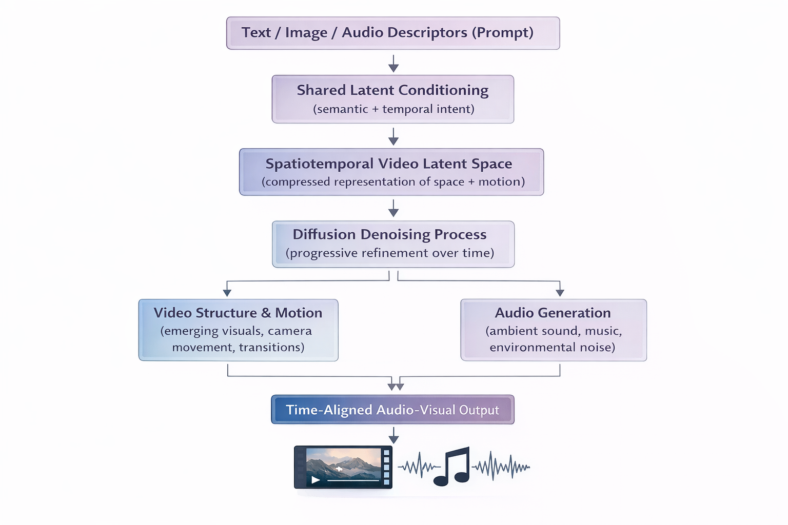 Text and image inputs are encoded in a shared latent conditioning space, allowing visual and audio generation to remain synchronized.
