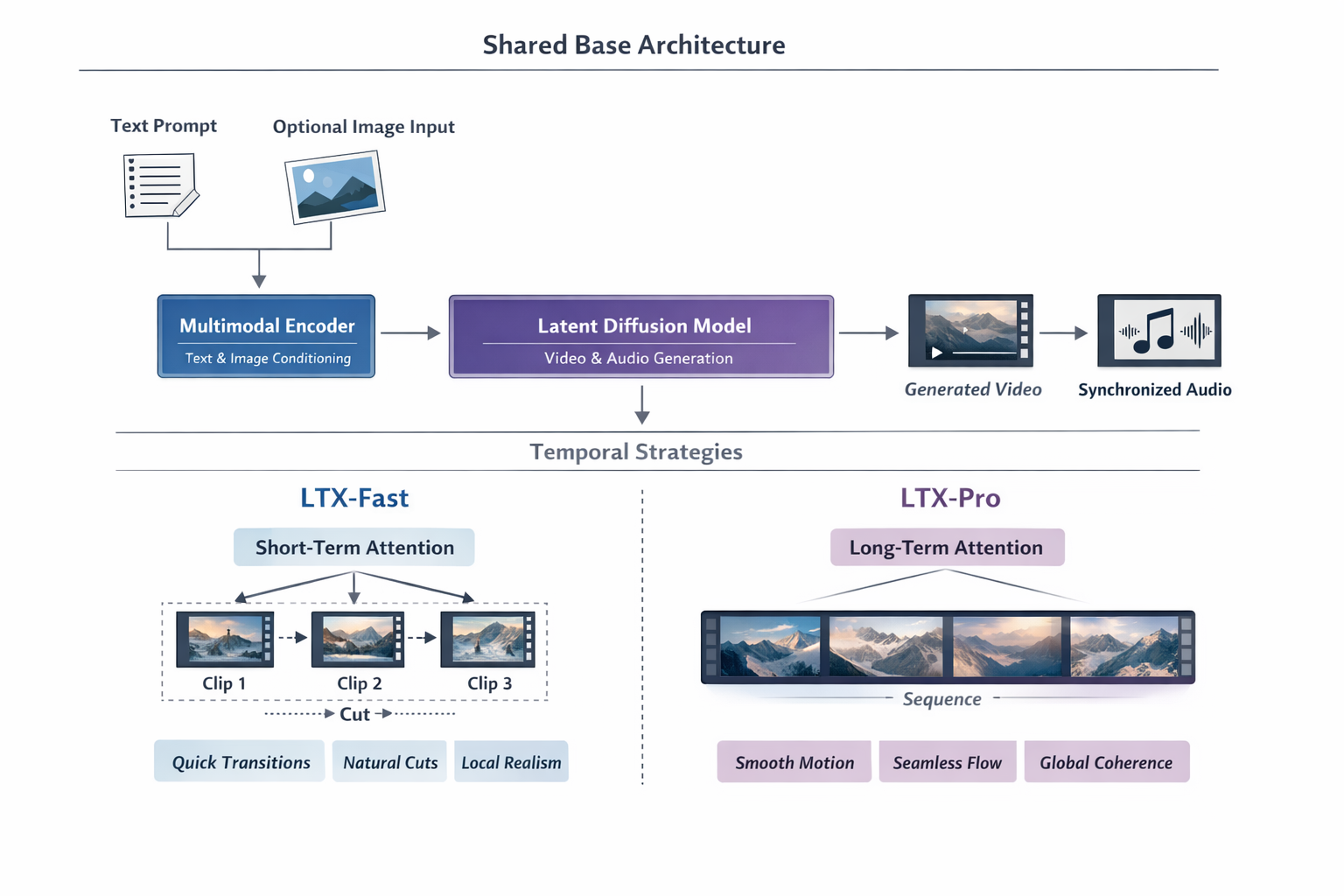 LTX-Fast and LTX-Pro share the same multimodal diffusion-based video architecture, including text–image conditioning, spatiotemporal latent modeling, and joint audio-video generation. The primary distinction lies in how temporal coherence is enforced: LTX-Fast emphasizes local, shot-level consistency, while LTX-Pro emphasizes global, sequence-level continuity.