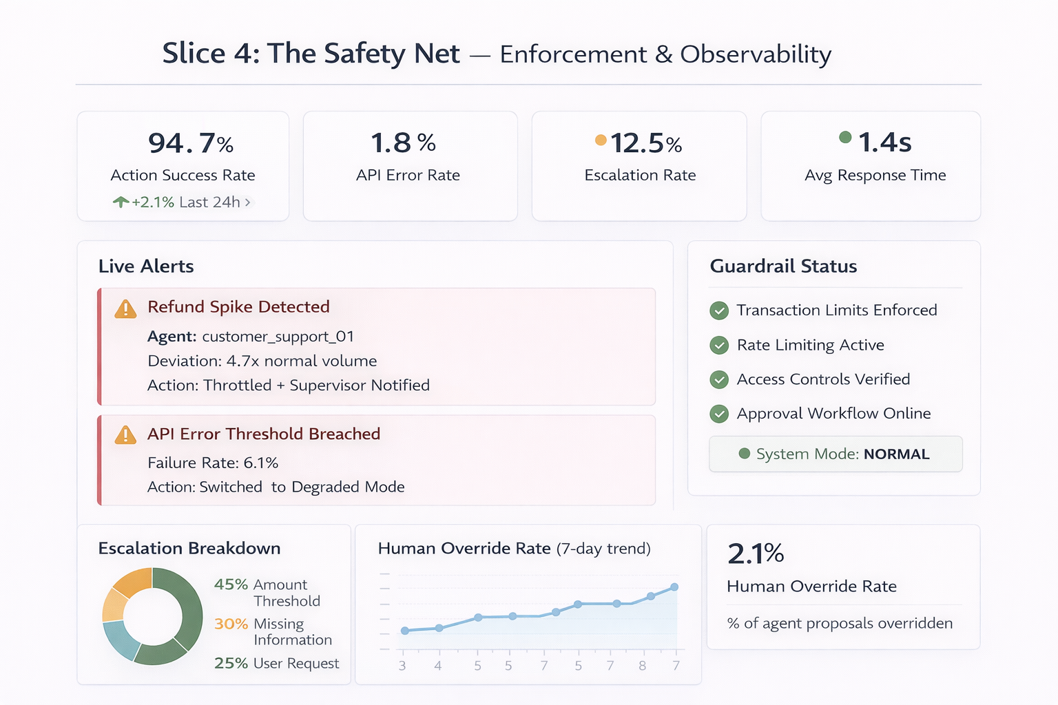 In practice, we have seen this architecture produce measurable results: error rates fall, rollback incidents decline, support tickets related to agent mistakes decrease, and clients gain the confidence to give agents real operational responsibility, not just low-stakes tasks.