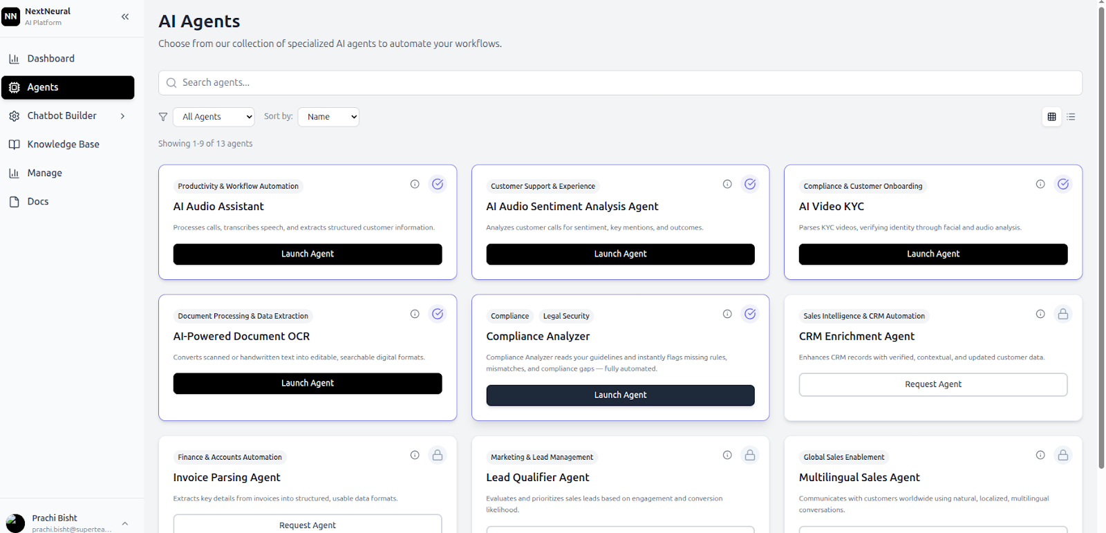 From the NextNeural dashboard, launch the Compliance Assistant agent. This starts the compliance workflow and makes the ingestion, guideline, and AI Assistant modules available.