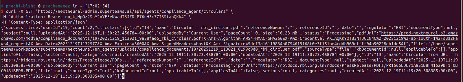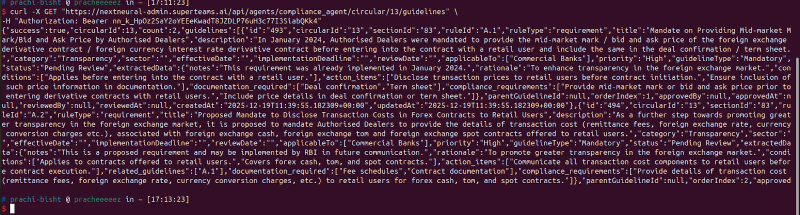 > -d '{"force_reprocess": true}'$ curl -X GET "https://nextneural-admin.superteams.ai/api/agents/compliance_agent/circular/13/guidelines" \